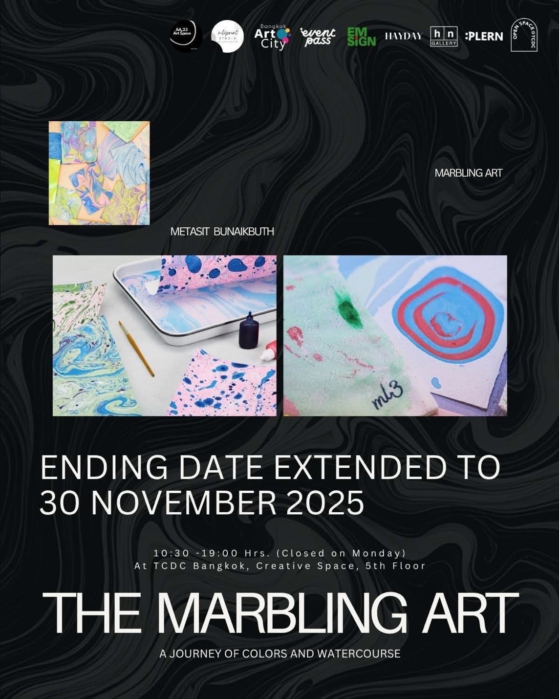 ขยายเวลาจัดแสดง! นิทรรศการ The Marbling Art: การเดินทางของสีและสายน้ำ โดย เมธาสิทธิ์ บุญเอกบุศย์ (Metasit Bunaikbuth) ศิลปินผู้เชี่ยวชาญด้านภาพพิมพ์และ Marbling Art ถ่ายทอดมนตร์เสน่ห์ของสีและสายน้ำผ่านผลงานที่เปี่ยมไปด้วยอารมณ์ ความรู้สึก และแรงบันดาลใจ โดยได้รวบรวมผลงานจากผู้เข้าร่วมเวิร์กช็อปในเดือนกันยายนที่ผ่านมาเป็นส่วนหนึ่งของนิทรรศการ