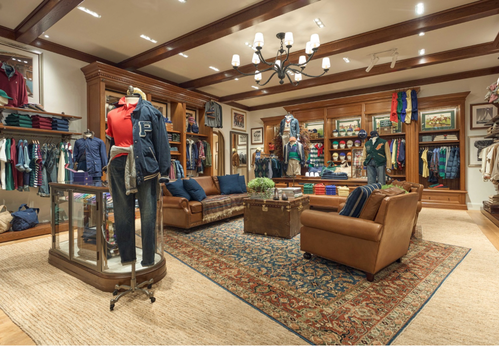 พื้นที่ภายในถูกออกแบบอย่างพิถีพิถันด้วยบรรยากาศที่อบอุ่นและคลาสสิก โดยใช้พื้นไม้โอ๊กกว้างและหินไลม์สโตน ผนังปูนฉาบทำมือ และเพดานคานไม้สูง เพื่อสร้างความหรูหราทว่าเป็นกันเอง รายละเอียดอย่างตู้หนังสือไม้โอ๊กแบบสั่งทำพิเศษ เฟอร์นิเจอร์ที่คัดสรรอย่างประณีต พรมซ้อนเลเยอร์ และงานศิลปะชิ้นเด่น ล้วนช่วยย้ำถึงความคลาสสิกและมรดกอันยาวนานของแบรนด์ พร้อมมอบประสบการณ์ช้อปปิ้งระดับพรีเมียมที่สะท้อนตัวตนของ Ralph Lauren อย่างแท้จริง