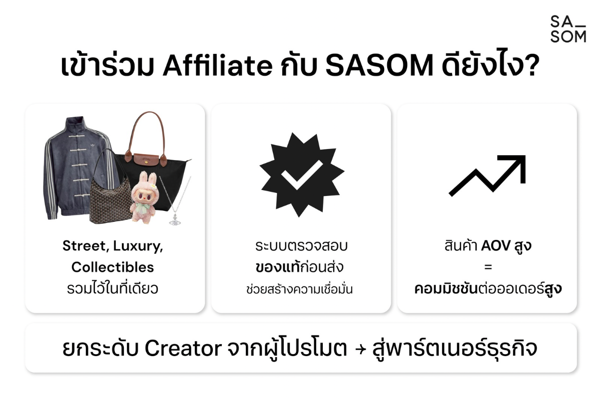 SASOM แพลตฟอร์มรวมสินค้าแฟชั่นและของสะสมของแท้ ประกาศเปิดตัว SASOM Affiliate Program (SAP) อย่างเป็นทางการ เดินหน้าสร้าง Fashion Creator Ecosystem ที่เชื่อมต่อ Creator ผู้บริโภค และตลาดแฟชั่นเข้าไว้ด้วยกันอย่างเป็นระบบ พร้อมวางรากฐานระยะยาวในการขับเคลื่อน Creator Economy ควบคู่ไปกับการเติบโตของอุตสาหกรรมแฟชั่นและสินค้าสะสมในประเทศไทย