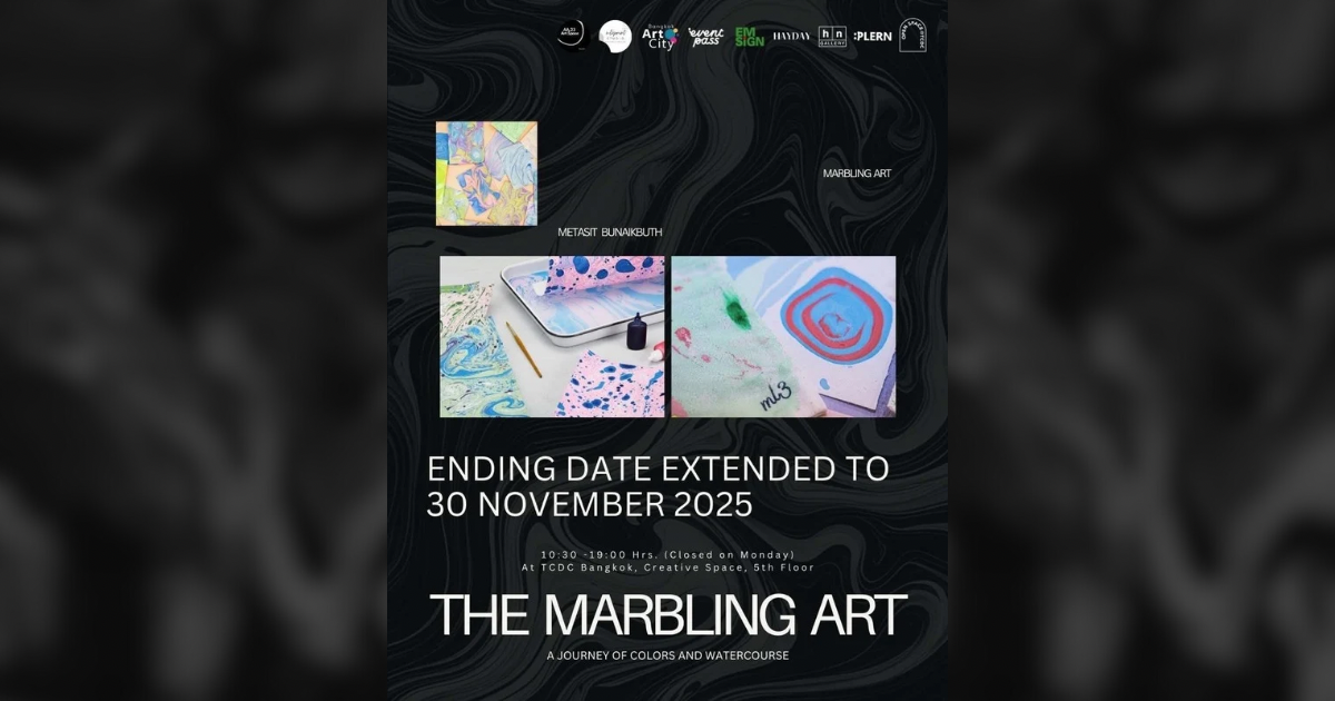 ขยายเวลาจัดแสดง! นิทรรศการ The Marbling Art: การเดินทางของสีและสายน้ำ โดย เมธาสิทธิ์ บุญเอกบุศย์ (Metasit Bunaikbuth) ศิลปินผู้เชี่ยวชาญด้านภาพพิมพ์และ Marbling Art ถ่ายทอดมนตร์เสน่ห์ของสีและสายน้ำผ่านผลงานที่เปี่ยมไปด้วยอารมณ์ ความรู้สึก และแรงบันดาลใจ โดยได้รวบรวมผลงานจากผู้เข้าร่วมเวิร์กช็อปในเดือนกันยายนที่ผ่านมาเป็นส่วนหนึ่งของนิทรรศการ
