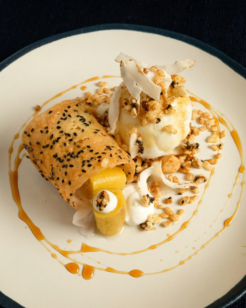 Kub Wan (กับหวาน) ปิดท้ายมื้อด้วยของหวานแบบไทยๆ ที่ทางทีมเชฟได้หยิบเอาขนมไทยดั้งเดิมมาสร้างสรรค์ให้มีลูกเล่นกว่าเคย อย่าง กล้วยไข่เชื่อม ไอศครีมข้าวเม่ากะทิ และกระยาสารทกรอบ จานนี้เป็นการรวมกันของกล้วยเชื่อมไทยๆ ทานคู่กับข้าวเม่าที่ทำเป็นไอศกรีม และเพิ่มความกรุบกรอบด้วยกระยาสารทน้ำอ้อย