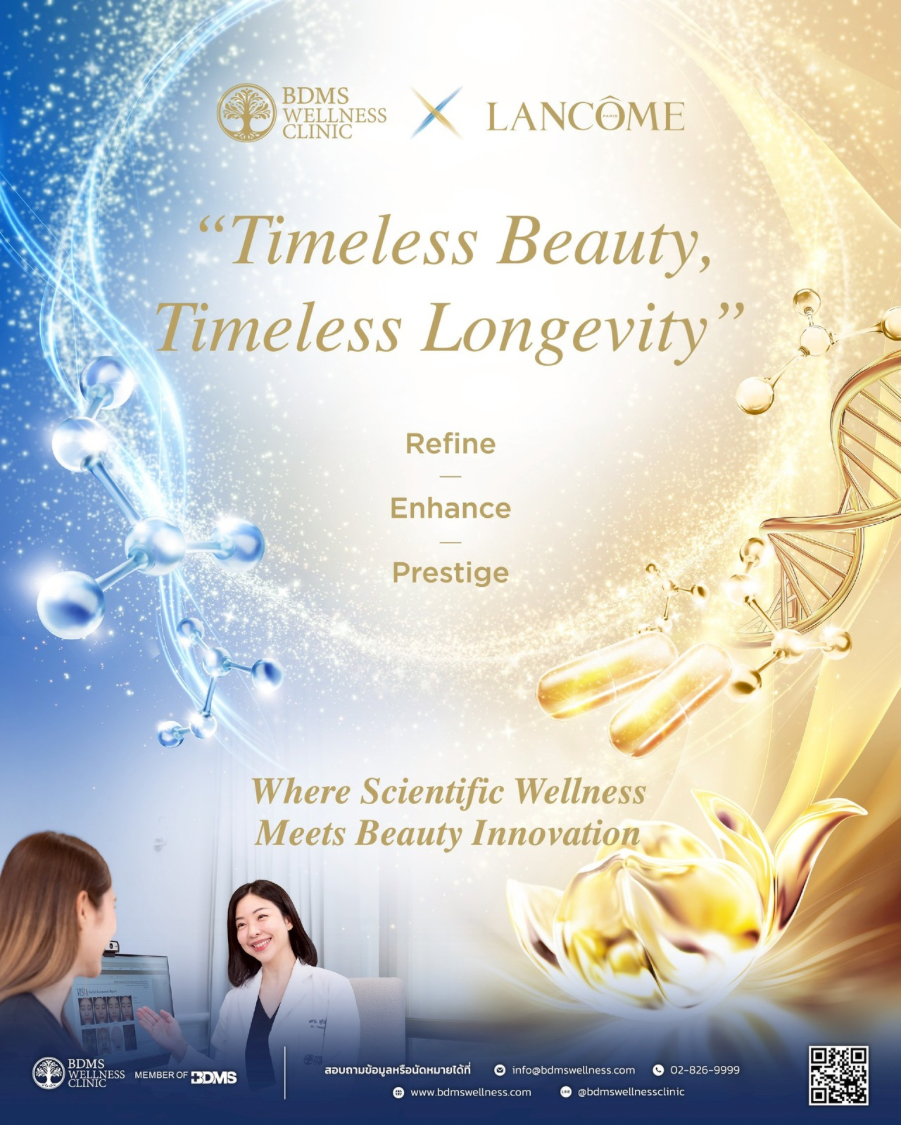 บีดีเอ็มเอส เวลเนส คลินิก (BDMS Wellness Clinic) ศูนย์สุขภาพเชิงป้องกันในเครือ บริษัท กรุงเทพดุสิตเวชการ จำกัด (มหาชน) เดินหน้าขยายศักยภาพสู่ตลาดความงาม จับมือ Lancôme ภายใต้ บริษัท ลอรีอัล (ประเทศไทย) จำกัด แบรนด์ความงามระดับโลกจากประเทศฝรั่งเศส ตอบรับการเติบโตของอุตสาหกรรม Personal Care & Beauty ทั่วโลกที่มีมูลค่าสูงกว่า 1.35 ล้านล้านดอลลาร์สหรัฐ ในปี ค.ศ. 2024 มอบประสบการณ์การดูแลสุขภาพผิวภายใต้แนวคิด “Timeless Beauty, Timeless Longevity” ที่ผสานศาสตร์แห่ง Scientific Wellness เข้ากับศิลปะแห่งความงาม เพื่อสร้างผลลัพธ์ที่เปล่งประกายจากภายในสู่ภายนอกอย่างยั่งยืน