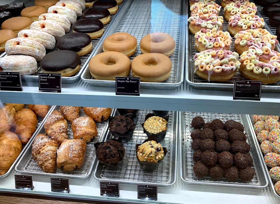 ฝั่งไทยร้านเด็ดๆก็มีเยอะ มาถึงฝั่งต่างประเทศบ้างดีกว่าค่ะ กับ Tim Hortons ร้านกาแฟและโดนัทชื่อดังจากแคนาดา ที่มีมาประมาณ 56 ปีที่แล้ว โดยนายทิม ฮอร์ตันส์ เขาเป็นนักกีฬาฮอกกี้ทีมชาติชื่อดัง ในปัจจุบันมีจำนวนสาขามากกว่า 4,850 สาขาทั่วโลก โดยราคาของโดนัทขายประมาณชิ้นละ 30-35 บาท ที่ขอแนะนำเลยก็คือเมนู Maple Dip ที่ผิวด้านหน้าเคลือบจนหนา โดนัทเนื้อนุ่มมีความหอมหวานชัดเจนสุดๆ หรือไม่ว่าจะเป็น Strawberry Snow เนื้อโดนัทจะมีความเนียนนุ่ม ไส้สตอเบอร์รี่ที่ฉ่ำ แถมยังไม่หวานมาก